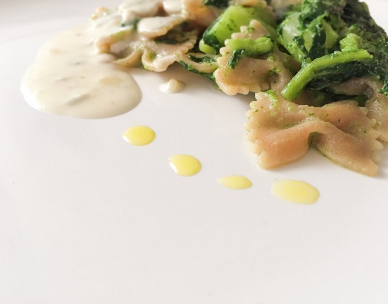 Scolate la pasta al dente e saltatela in padella con le cime di rapa aggiungendo un po' di brodo di cottura e a fuoco spento unite la crema di formaggi.