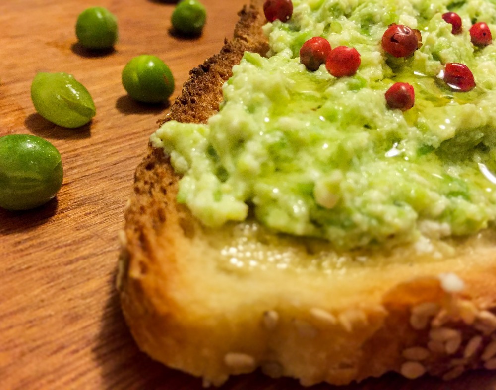 Infornate le fette di pane per un paio di minuti e dopo conditele con l'impasto formato, del pepe rosa e un filo d'olio biologico Giarì.