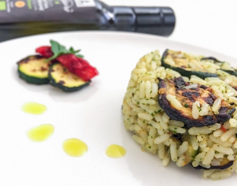 Unite le zucchine e il pesto al riso mescolando bene tutti i condimenti, lasciatelo riposare e servite con un filo d'olio biologico Giarì.