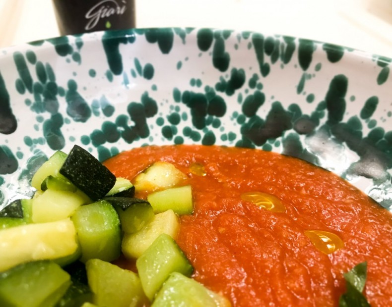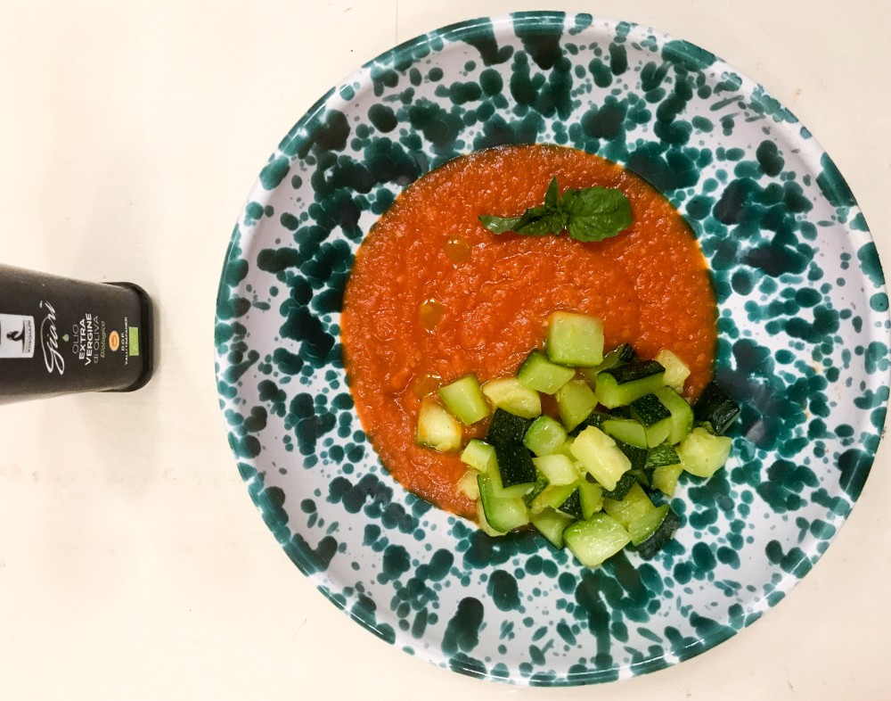 Riponete in un piatto fondo la vellutata e sopra le zucchine, completate con olio Giarì biologico.