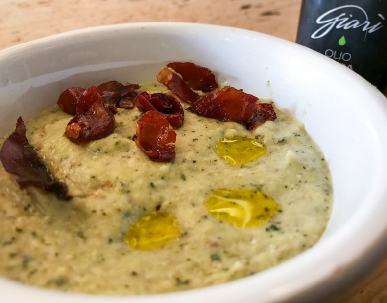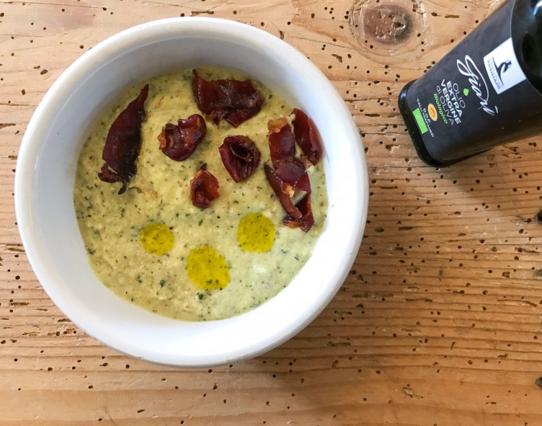 Ultimate il vostro piatto riponendo la vellutata in una terrina, sbriciolate lo speck sopra e condite con un filo d'olio Giarì.