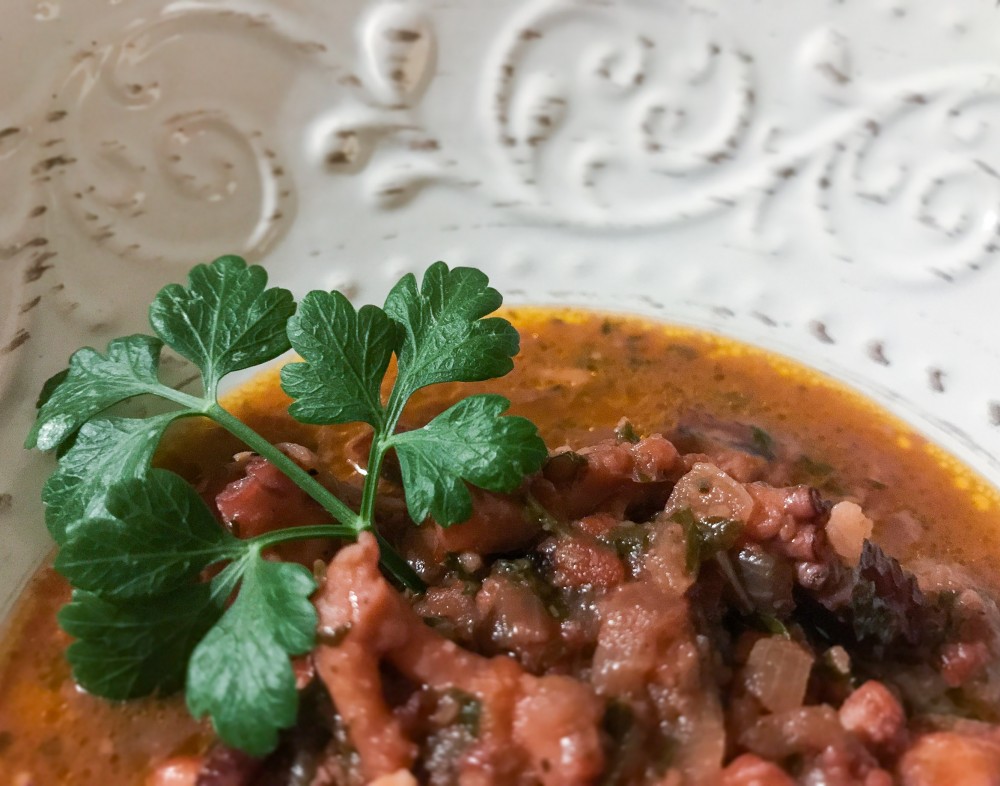 Unite il prezzemolo, il basilico, l'aglio e i capperi tutti triturati, subito dopo aggiungete i calamari tagliati a pezzetti; aumentate un po' la fiamma e sfumate con mezzo bicchiere di vino, dopo cinque minuti unite il pomodoro pelato e la foglia di alloro, salate e coprite con il coperchio abbassando la fiamma, lasciate cuocere almeno per un ora ricordandovi di mescolare ogni dieci minuti e aggiungendo del brodo di cottura se serve.
