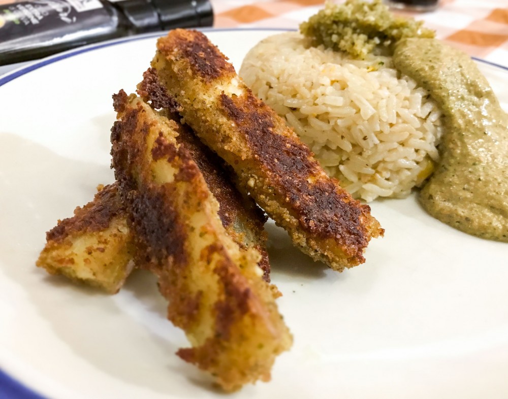 Questa è una ricetta che utilizza molti ingredienti tipici del nord della Colombia bagnata dal mar dei Caraibi, come la juca, ma al tempo stesso incontra i sapori tipici della Sicilia con il riso all'aglio e zenzero aromatizzato con i cachi.