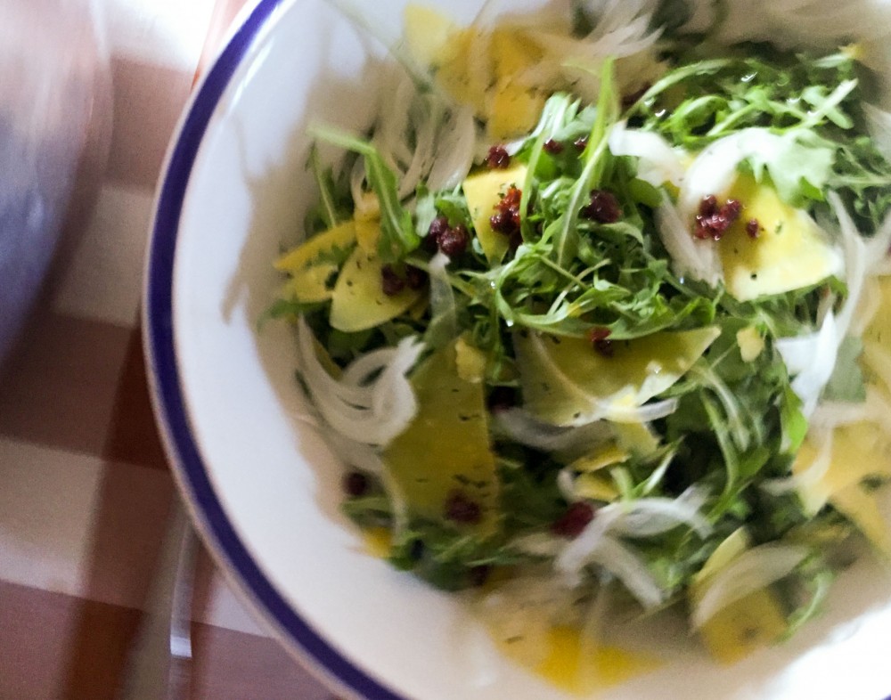 Aggiungete la rucola in un'insalatiera e il formaggio tagliato sottile, la cipolla, i pomorini secchi e un filo d'olio Giarì.