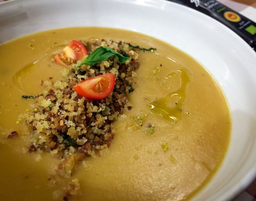 Ultimate ponendo la crema sul fondo di un piatto e sopra la mollica croccante con un filo d'olio Giarì.