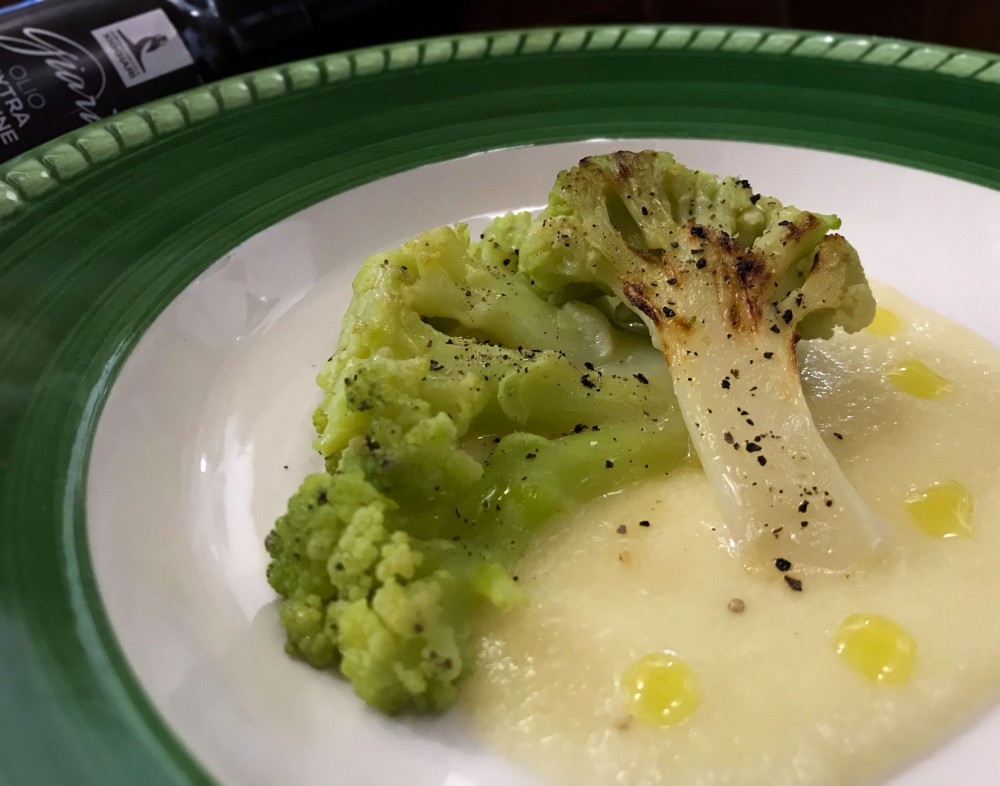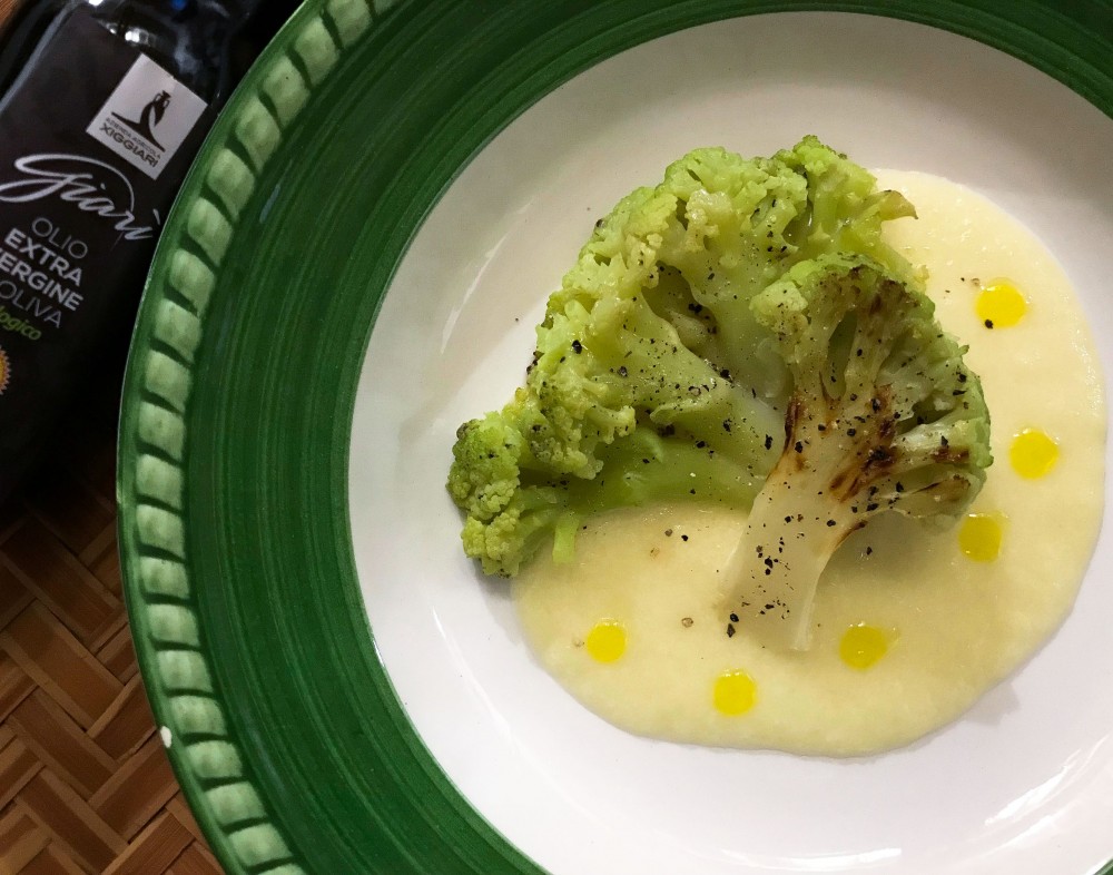 Ultimate il piatto ponendo alla base la crema di patate e sopra il broccolo con una macinata di pepe nero e un filo d’olio Giarì.
