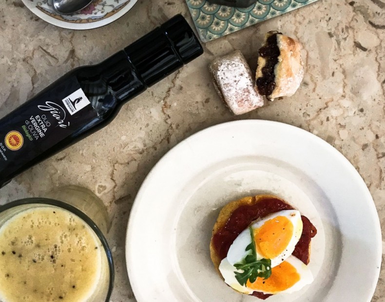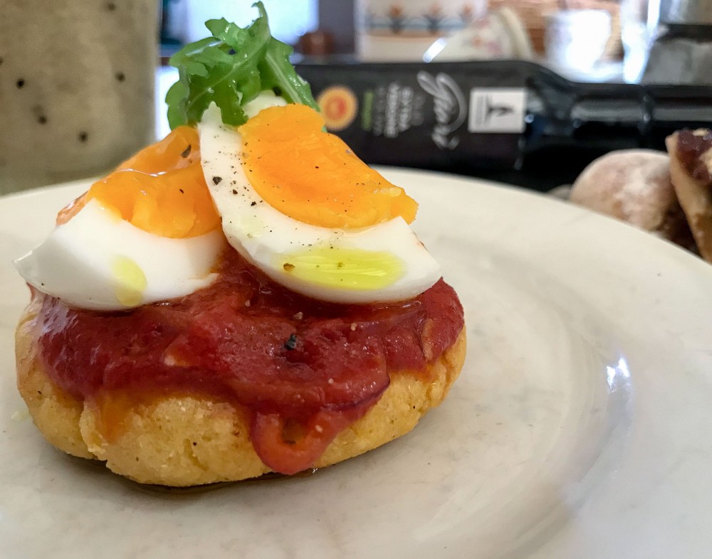 Ponete il pomodoro e l'uovo sopra l'arepa, una macinata di pepe nero e un filo di olio Xiggiari Biancolilla.