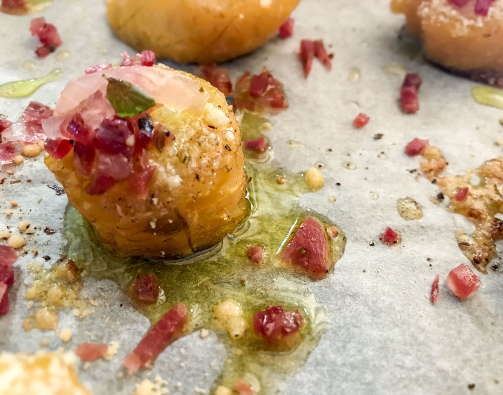 Ponete in cima dello speck tagliato a cubetti piccoli, caciocavallo grattugiato, una macinata di pepe nero e dell'olio evo.
