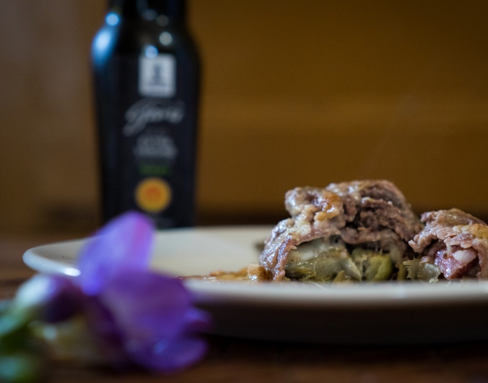 Prendete una fetta di lacerto e ponete al centro due piccoli tocchi di salsiccia pasqualora, uno medio di primosale, un po' di carciofi, una macinata di pepe nero, quindi chiudete il fagottino con dei stuzzicadenti.