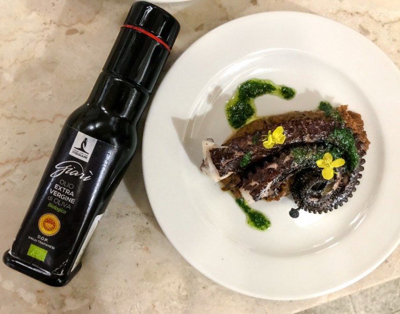 Terminate il piatto ponendo un cucchiaio abbindante di crema di zucca, due tentacoli di polpo e un cucchiaino del sarmoriglio con olio Giarì.