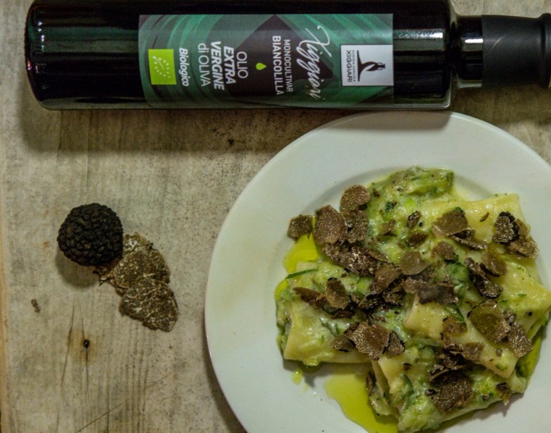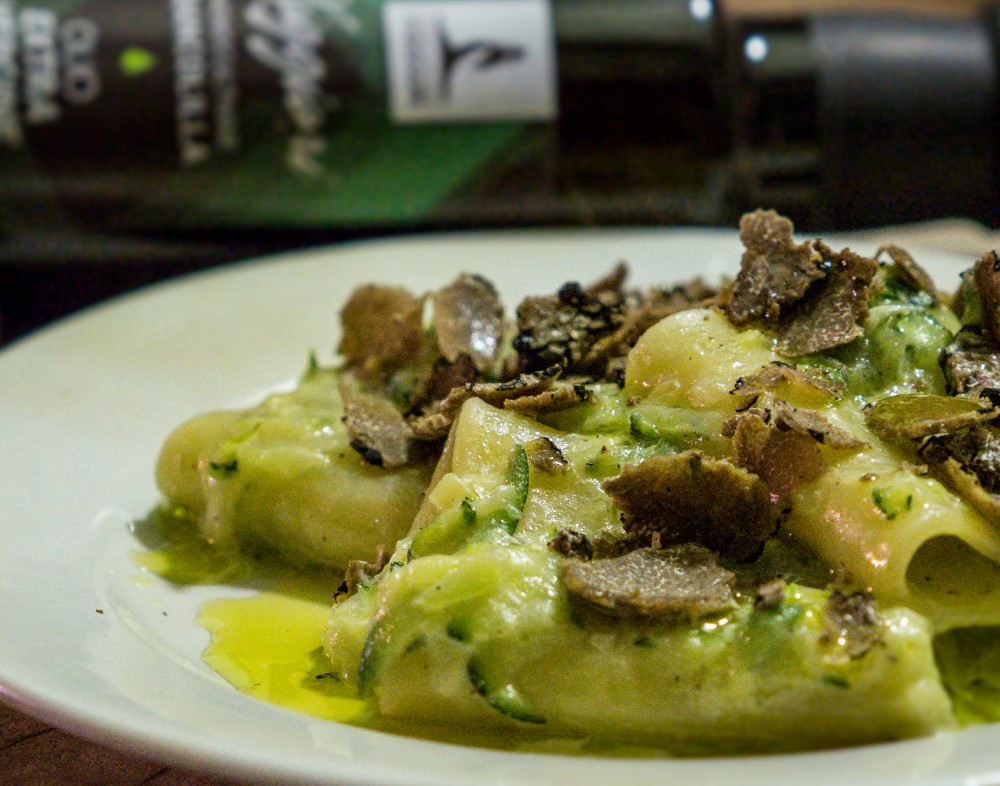 Scolate la pasta molto al dente e saltatela in padella assieme alle zucchine aggiungendo del brodo di cottura. A fuoco spento aggiungete la crema di formaggi, il tartufo grattugiato e un filo d'olio Xiggiari Biancolilla.