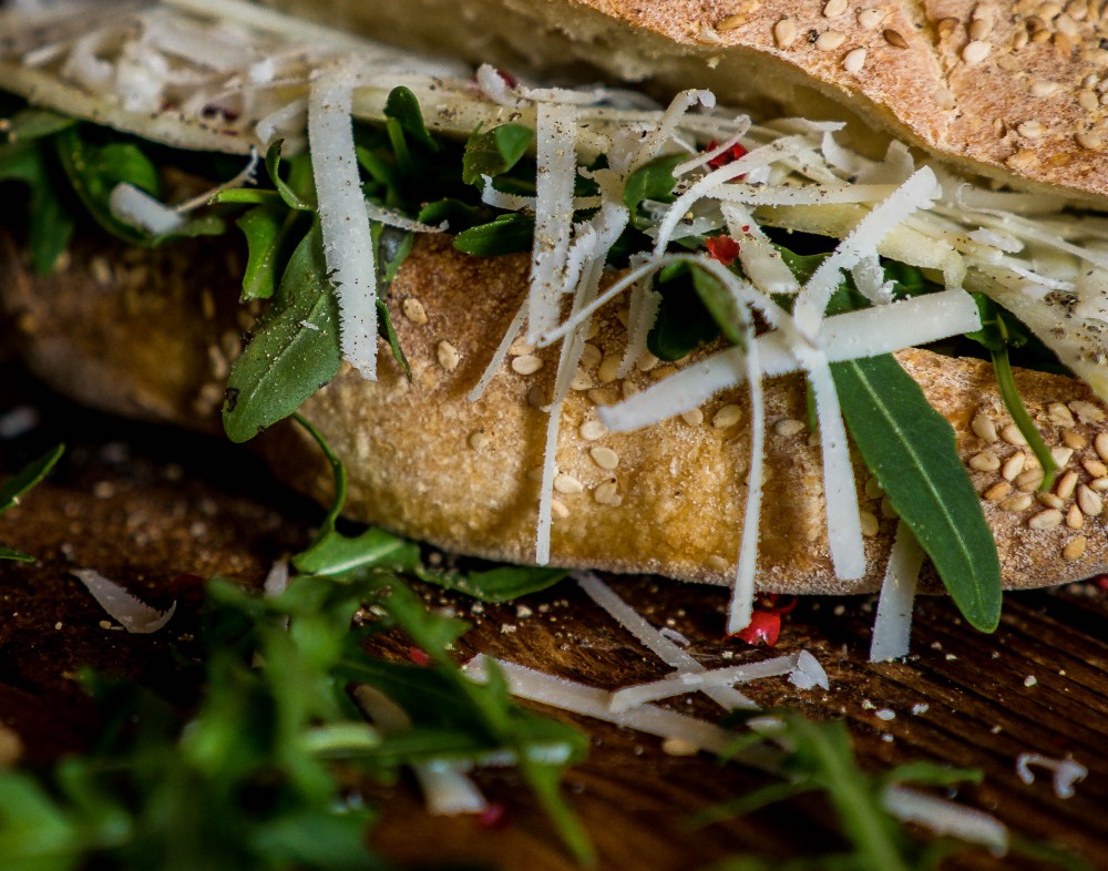 Terminate ponendo prima la rucola e dopo le scaglie di grana.