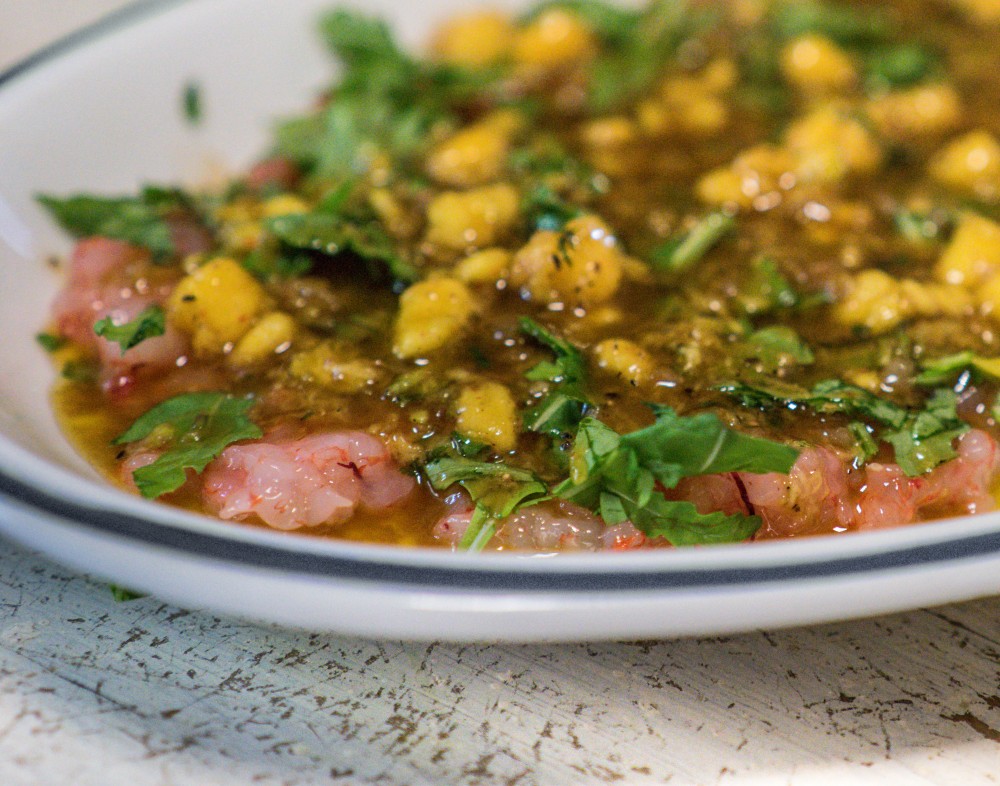 Riponete in un vassoio il gambero, salate e aggiungete la vinagreta precedentemente mescolata con il mango tagliato a cubetti.