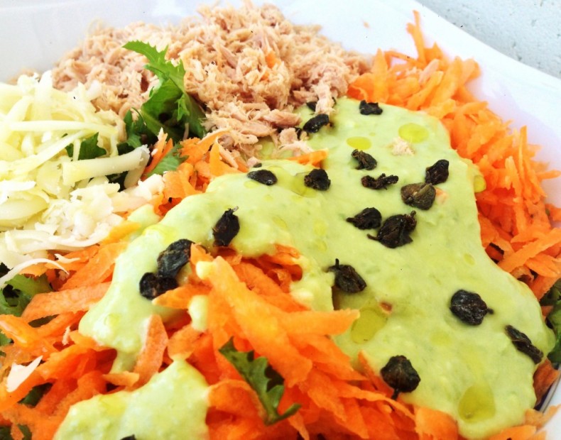 Lavate e tagliate l'insalata riccia e le carote alla julien, aggiungete un buon tonno in scatola ben sgocciolato e metà del grana tagliato a scaglie.
