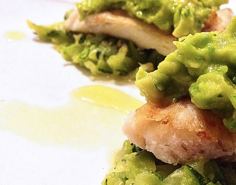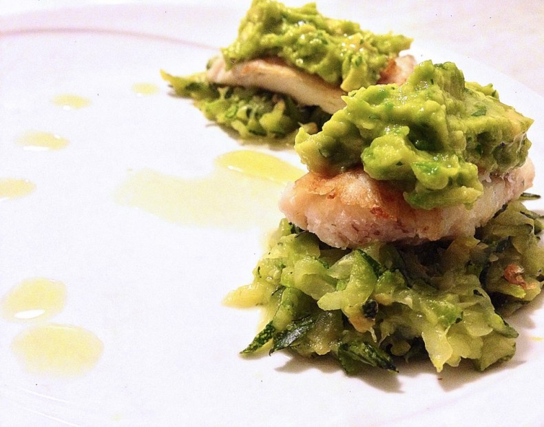 Per ultimo arrostite il filetto di merluzzo in una padella antiaderente, preparate il piatto con sotto le zucchine, il merluzzo e la crema di avocado sopra.