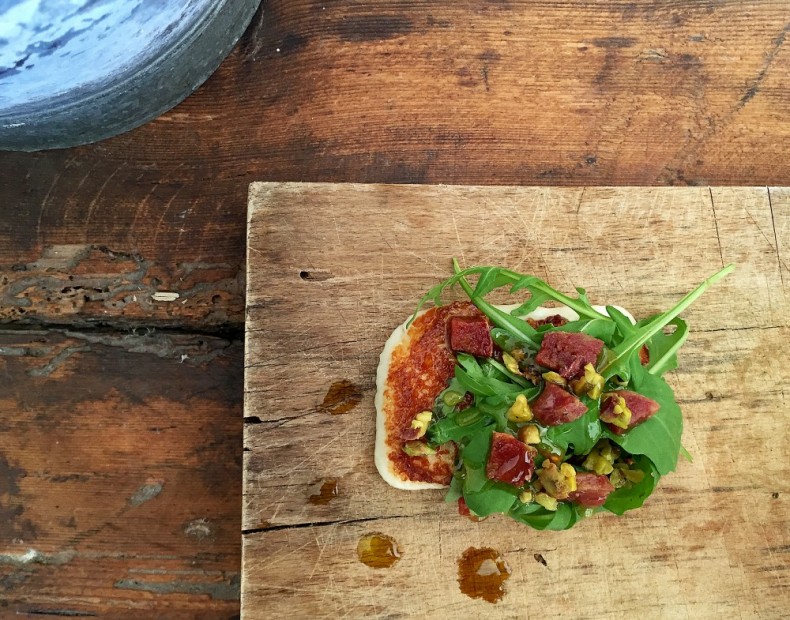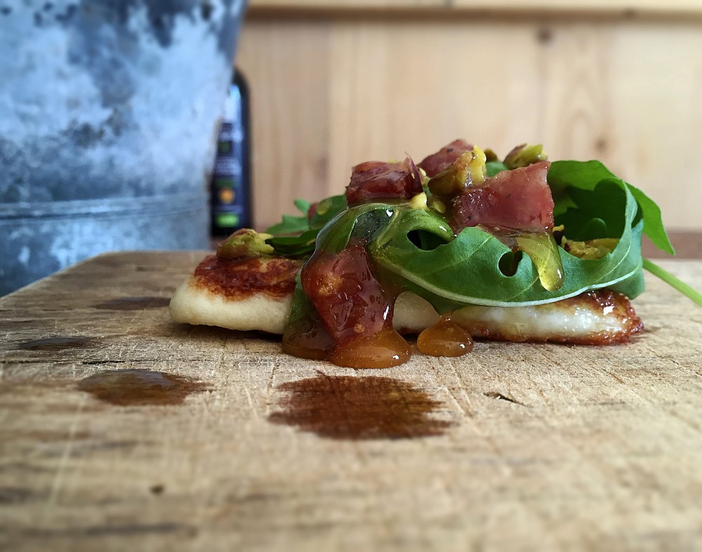 Formaggio grigliato con la dolcezza del miele, l'amaro della rucola e la croccantezza del pistacchio.