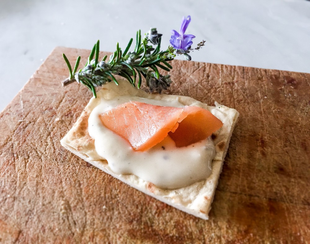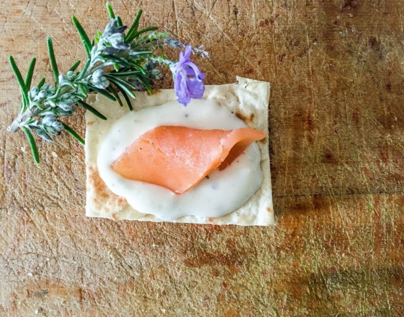 Completate il piatto ponendo sopra la piadina un cucchiaino di crema, il salmone e un filo d'olio Giarì.