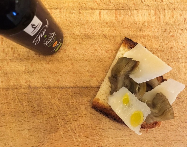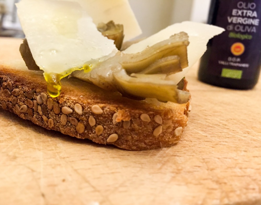 Tagliate una fetta di pane e passatela in forno per un paio di minuti, aggiungete i carciofi, le scaglie di grana e un filo d'olio Giarì.