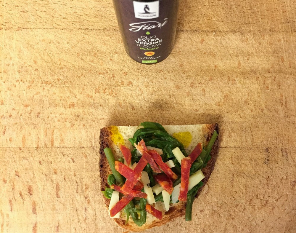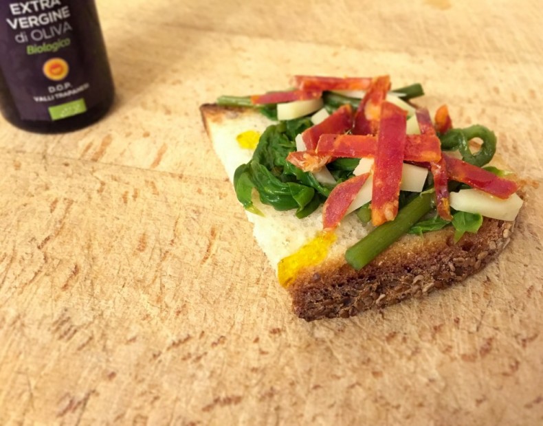 Antipasto ricco di ingredienti tipici siciliani: il pane fatto con la farina Senatore Cappeli e lievito madre, gli asparagi di stagione, il salamino piccante di maialino dei Nebrodi e il formaggio ragusano DOP...e naturalmente il nostro olio biologico Giarì.