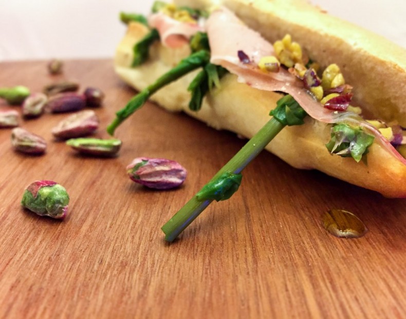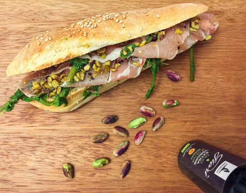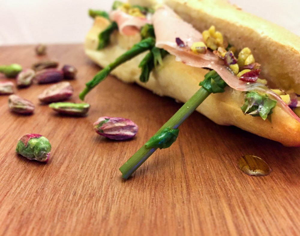 Componete il vostro panino con gli asparagi, il prosciutto crudo, i pistacchi triturati grossolanamente, del pepe macinato fresco e l'olio extravergine Giarì biologico.